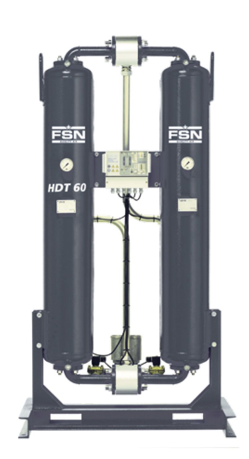 Rigenerati a freddo, gli essiccatori ad adsorbimento sono la soluzione ideale per applicazioni in cui un DewPoint di +3°C non è sufficiente, come nell'industria elettronica, farmaceutica, alimentare e nel trasporto pneumatico, o in installazioni esterne con basse temperature ambiente. Questi dispositivi garantiscono punti di rugiada fino a -70°C. Gli essiccatori ad adsorbimento serie HDT sono costituiti da due serbatoi paralleli riempiti di setaccio molecolare. Mentre una colonna essicca l'aria compressa, l'altra rigenera il dessicante saturo utilizzando una minima parte dell'aria già trattata. Vengono forniti con un filtro disoleatore da 0,01 micron in ingresso (con scaricatore automatico) e un filtro antipolvere da 1 micron in uscita, entrambi dotati di manometro differenziale. Questi filtri sono facilmente accessibili per la manutenzione e rientrano nell'ingombro complessivo dell'essiccatore.